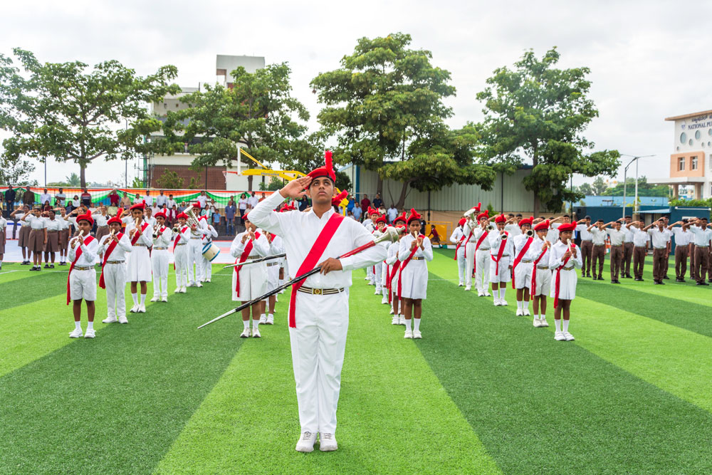 ceremonial splendour, bringing together students, staff, and guests in a heartfelt tribute to the spirit of freedom. The event commenced with the hoisting of the national flag as the tri-colour soared high to the resonant strains of the national anthem. This was followed by a crisp and coordinated march past by the students of Class 10, whose disciplined formation reflected pride and unity. The school band added grandeur to the occasion with a stirring display of patriotic tunes.