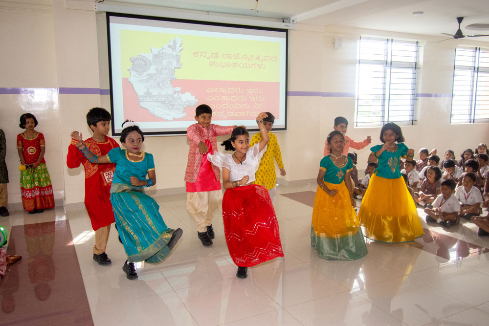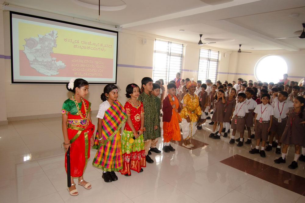 The school podium and the premises were bedecked with red and yellow drapery and flowers. The significance of the day was highlighted by the students of class 5 and class 2 conducting a special assembly in the auditorium. The presentation touched upon all the facets of Kannada history, language and culture through traditional dance forms and role play of different eminent personalities- all in the form of a well-crafted skit. It was heartwarming to see the energy and zeal of the students in depicting the glory of Karnataka. The event brought about a sense of pride in the audience as expressed through the positive feed backs from the parent fraternity.